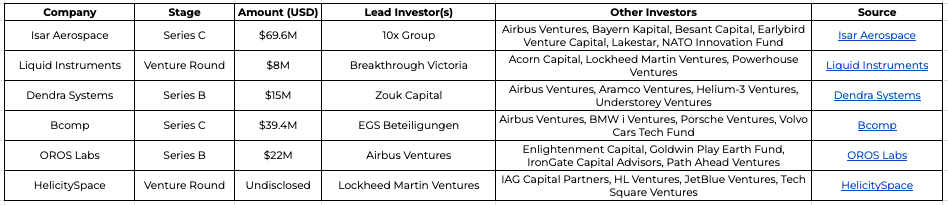 - OROS Labs: Raised $22 million in Series B funding to advance its high-performance thermal materials for extreme environments, with participation from Airbus Ventures.